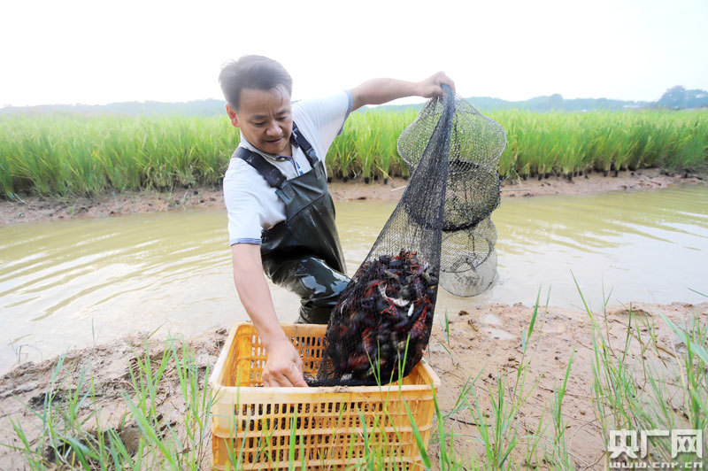 安?h竹江鄉(xiāng)小車村新通家庭農場負責人劉新益在捕撈小龍蝦(央廣網(wǎng)發(fā) 通訊員劉麗強 攝)