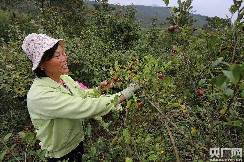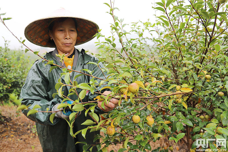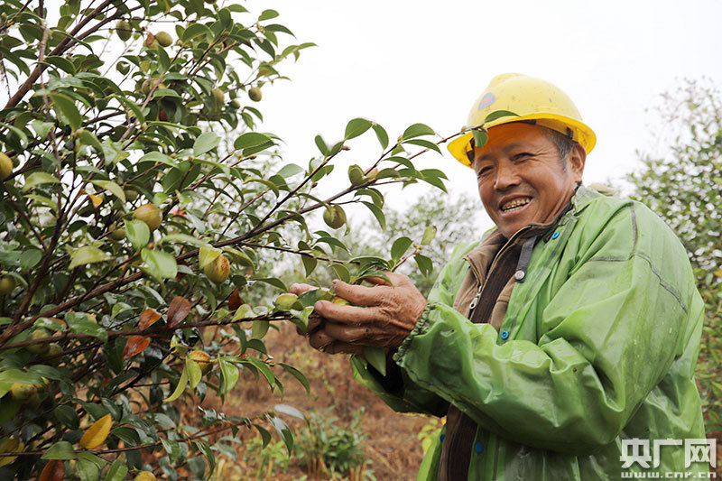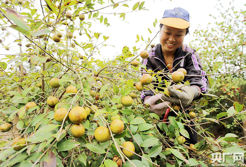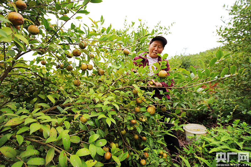 安?h嚴(yán)田鎮(zhèn)易家村村民在采摘油茶籽(央廣網(wǎng)發(fā) 通訊員劉麗強(qiáng) 攝)
