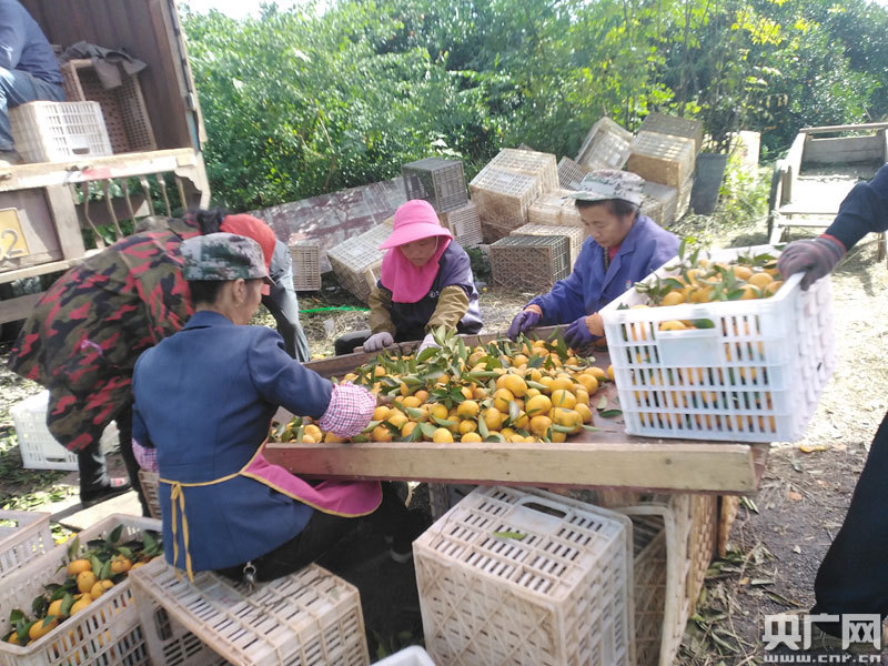 貧困戶們擇選蜜桔裝欄裝車(央廣網(wǎng)發(fā) 通訊員供圖)