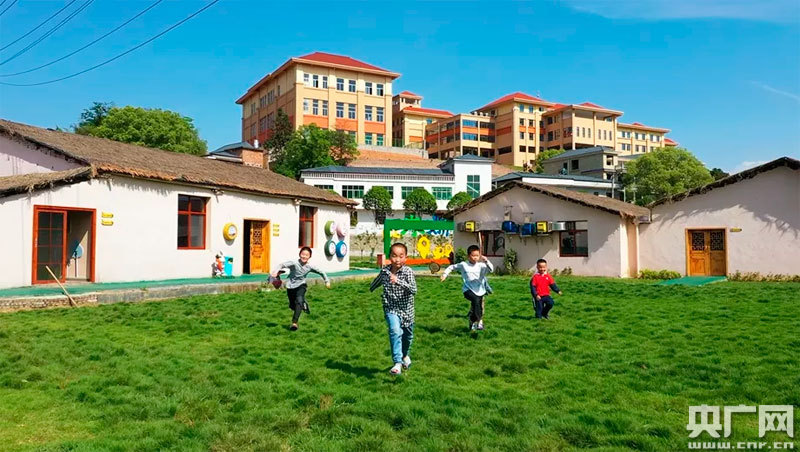 孩子們?cè)诩t領(lǐng)巾營(yíng)地前的草地上開(kāi)心的奔跑