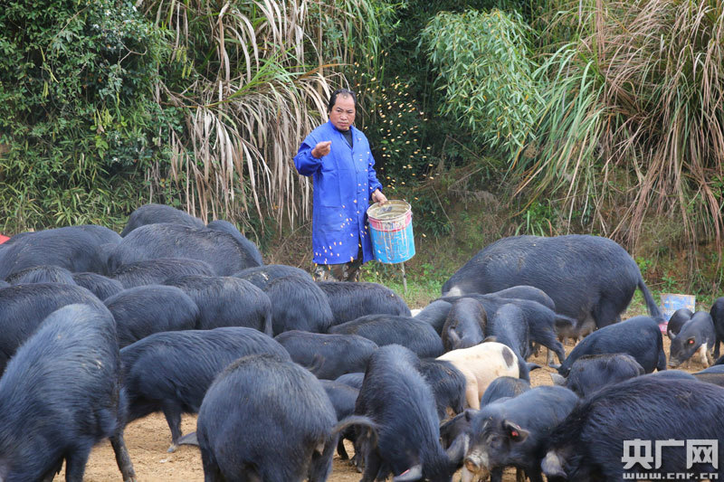 離福順食用菌基地不遠處,桐林鄉(xiāng)廟口村愛坑養(yǎng)殖基地已經(jīng)熱鬧起來!柏i倌”周勇將準(zhǔn)備好的豆腐渣均勻灑在豬欄里,300多只藏香豬浩浩蕩蕩下山,一窩蜂地圍在豬欄進口處等待喂食。