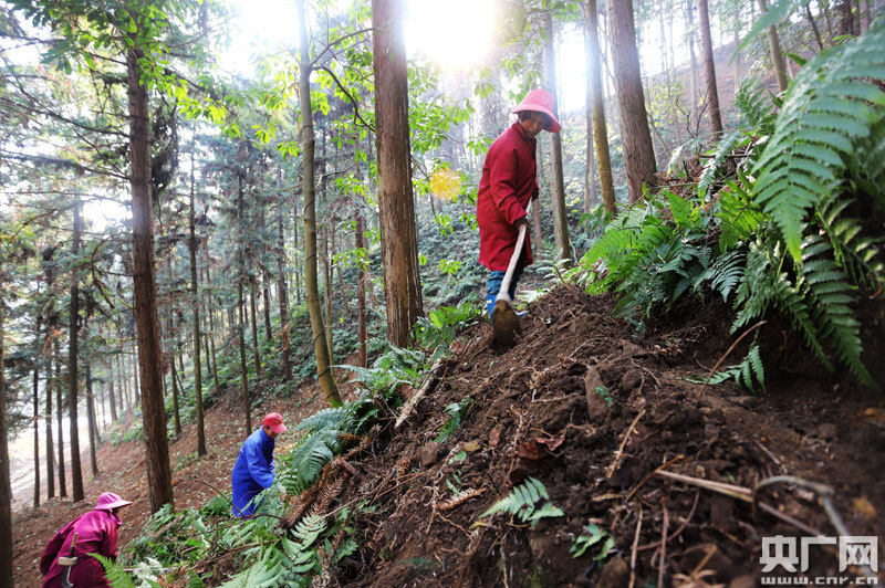 山莊鄉(xiāng)農(nóng)民在陳山紅心杉大徑材基地種植中藥材黃精(央廣網(wǎng)發(fā) 通訊員劉麗強(qiáng) 攝)