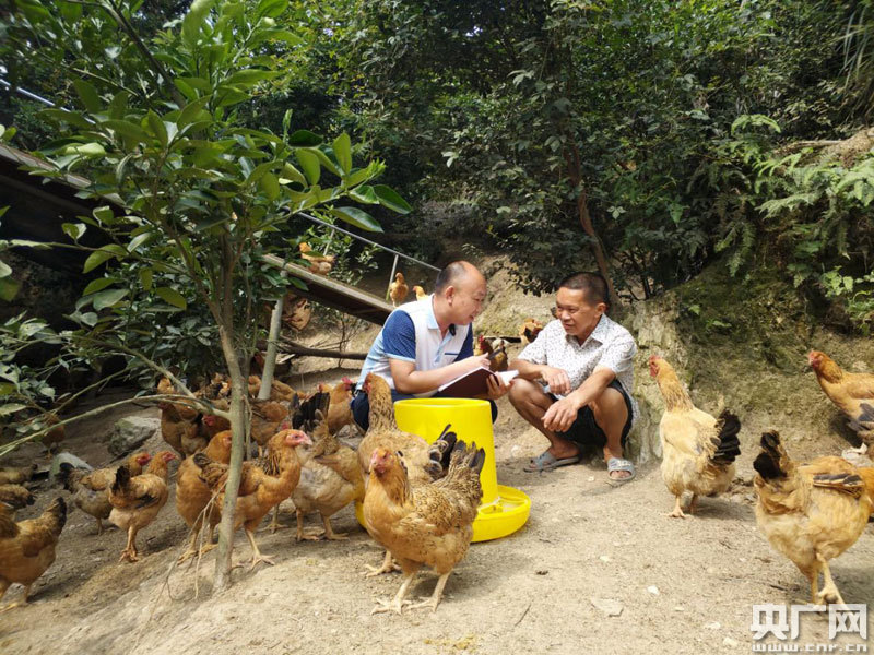 戴宏秋和他的扶貧對(duì)象一起討論養(yǎng)殖技術(shù)(央廣網(wǎng)發(fā) 通訊員供圖)