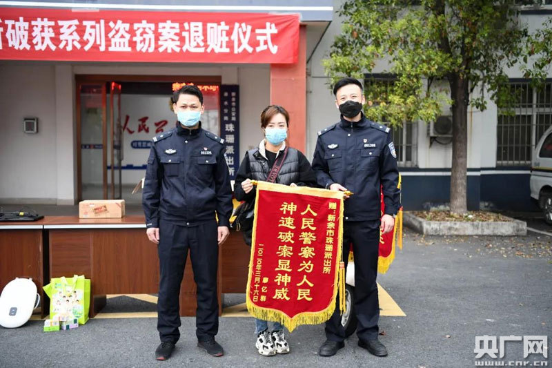 央廣網(wǎng)渝水3月17日消息(記者王一凡 通訊員謝文 邵凱)“雖然你們民警戴著口罩認不清是誰,但是我打心底感謝你們,正是因為有你們的辛苦付出,幫我們追回了這么多被偷的東西,才讓我們避免遭受更大的經(jīng)濟損失,非常感謝你們!”3月16日上午,在新余市公安局渝水分局珠珊派出所破獲系列盜竊案退贓儀式現(xiàn)場,新余市民謝女士舉著一面印有“人民警察為人民破案神速顯神威”的錦旗激動不已。民警根據(jù)案件偵辦情況和報案人信息,將追繳到的謝女士店內(nèi)被盜的大量白酒返還給了她。同時被退贓的還有其他2家臨街店鋪被盜的筆記本電腦、銀飾玉器、手表、煙酒、日用品、食品等物品。
