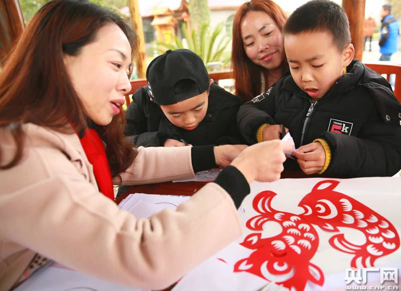2019年2月13日,剪紙藝人在江西省泰和縣馬市鎮(zhèn)蜀口村手把手教當(dāng)?shù)睾⒆蛹按迕窦艏埣记。寒假期間,江西省泰和縣組織當(dāng)?shù)孛耖g藝人走進(jìn)鄉(xiāng)村,為當(dāng)?shù)睾⒆蛹按迕裾故炯艏埖葌鹘y(tǒng)文化藝術(shù),現(xiàn)場(chǎng)指導(dǎo)他們進(jìn)行剪紙創(chuàng)作,讓孩子們親身感受中國(guó)民間傳統(tǒng)文化的獨(dú)特藝術(shù)魅力,豐富寒假生活。(央廣網(wǎng)發(fā) 通訊員司馬天民 攝)
