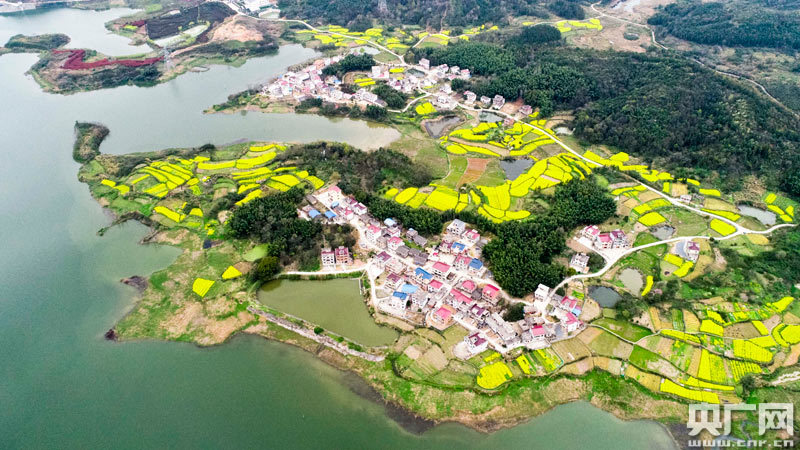 3月26日,無人機(jī)拍攝的湖口縣付垅鄉(xiāng)殷山村美如畫境。春分時(shí)節(jié),金黃的菜花,清澈的庫水,翠綠的山巒,與依山傍水的村莊相映成景,美不勝收