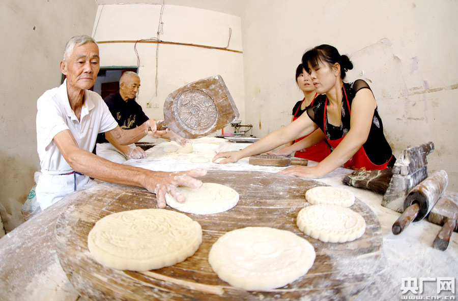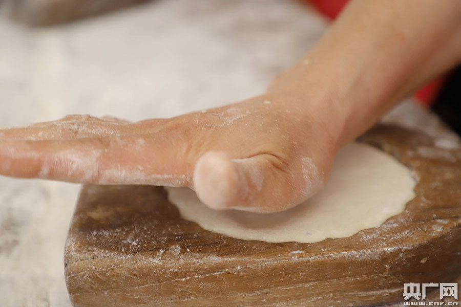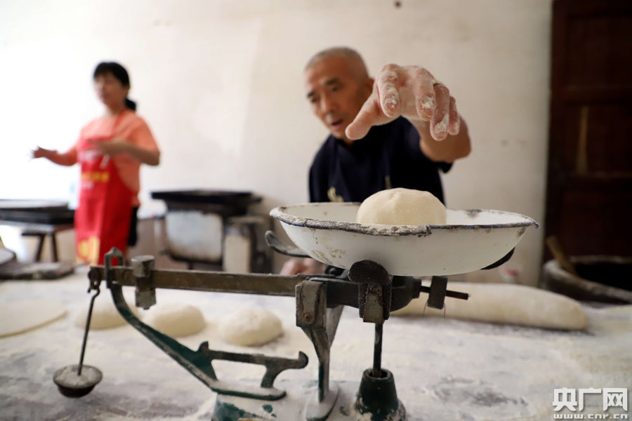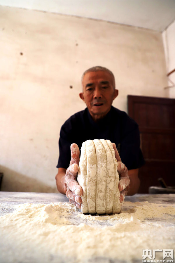 傍晚時(shí)分,手工作坊里,“砰砰”的壓面聲還在響,一個(gè)個(gè)又大又圓發(fā)餅出爐,那香味里透著一股團(tuán)圓的味道。