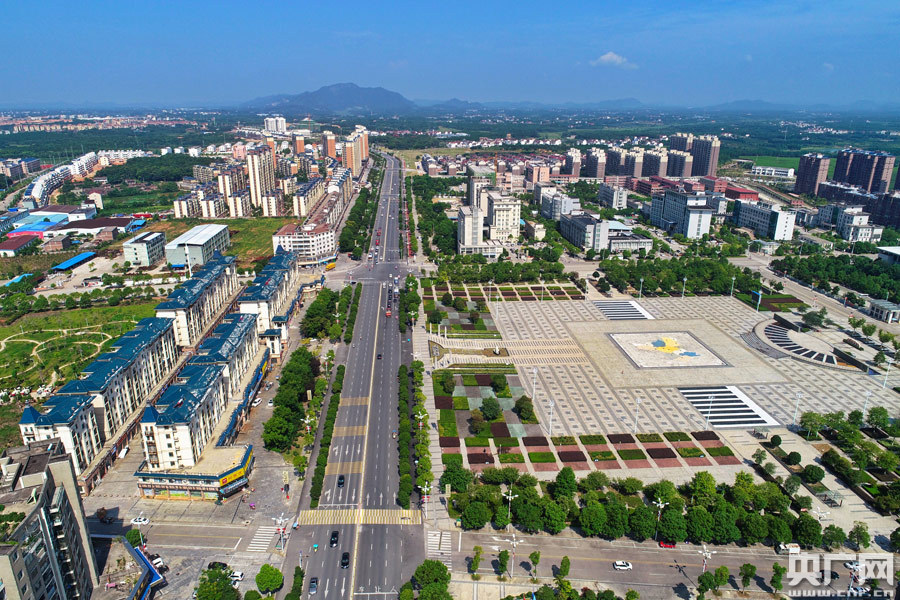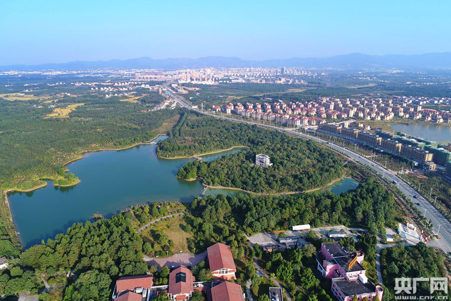 2019年9月11日,無人機航拍下的江西省金溪縣新城區(qū),天藍水碧,綠樹成蔭,宜居宜游。(鄧興東 攝)