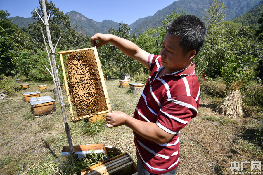 2019年9月25日,江西省撫州市金溪縣何源鎮(zhèn)北源村土蜂養(yǎng)殖大戶余友堂在對(duì)蜂箱進(jìn)行日常檢查。目前他已養(yǎng)殖土蜂120余箱,馴養(yǎng)野生土蜂10余箱。 (鄧興東 攝)
