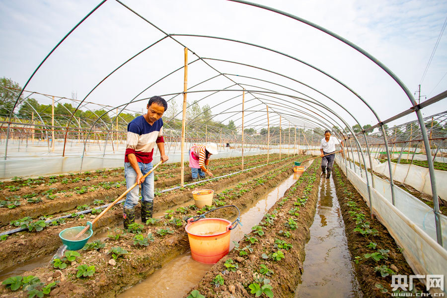 央廣網(wǎng)湖口10月10日消息(記者王一凡 通訊員張玉)寒露,清晨,微風(fēng)。半大的草莓苗抖落蔓藤上的甘露,努力蹬足拔節(jié),徐高勇夫婦和父親三人正在給剛栽不久的草莓苗追施底肥。