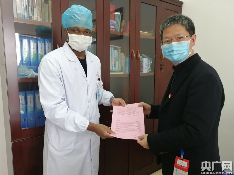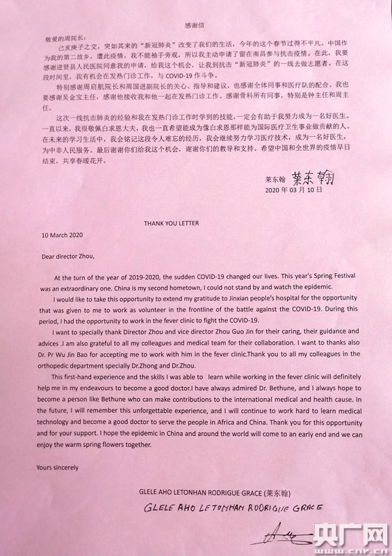 3月11日,在進(jìn)賢縣人民醫(yī)院實(shí)習(xí)的貝寧留學(xué)生萊東翰把一封中英雙語(yǔ)的感謝信送到院長(zhǎng)周啟航手中,感謝醫(yī)院在其實(shí)習(xí)期間給予的關(guān)心幫助,難舍一起戰(zhàn)斗過的戰(zhàn)“疫”歲月。