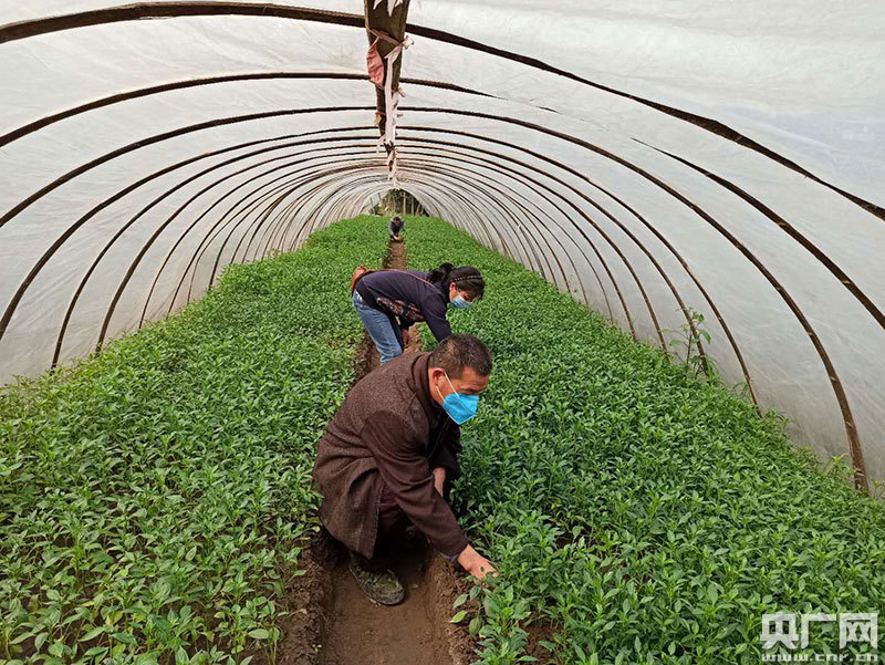 桂香嫂夫妻倆正在大棚里拔秧苗