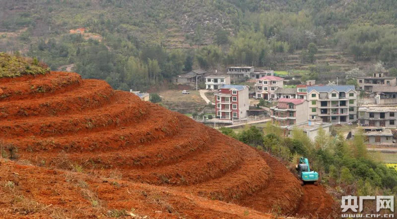 在該鄉(xiāng)島山村的山崗上記者看到,機(jī)器轟鳴,春風(fēng)蕩漾。幾臺(tái)大型挖掘機(jī)來回?cái)[臂,身后一壟壟新翻的土地順著山勢(shì)蜿蜒起伏,層層疊疊,煞是好看。