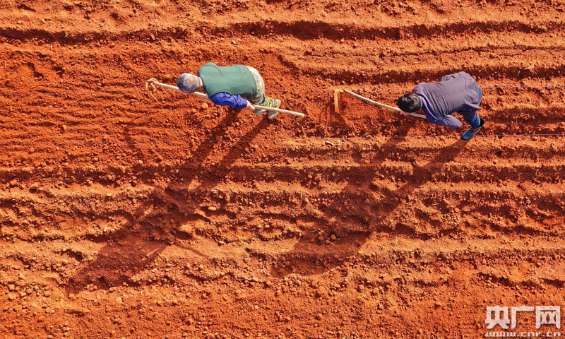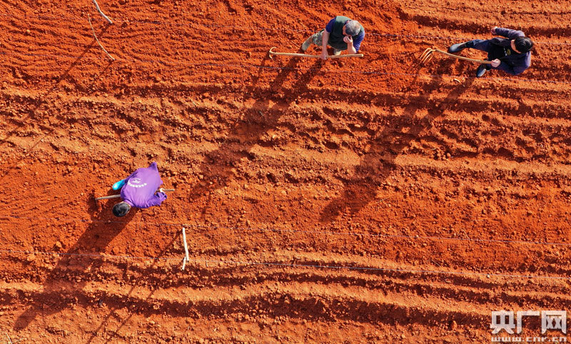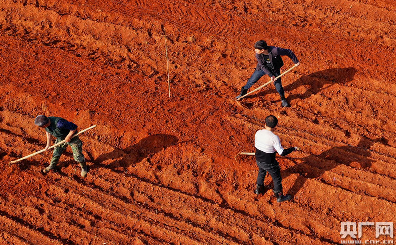 農(nóng)民正在紅土地上整地勞作(央廣網(wǎng)發(fā) 通訊員鄧和平/攝)