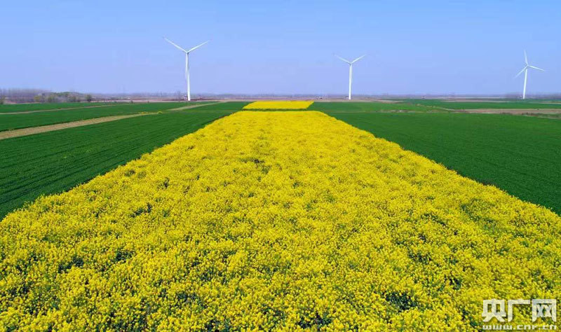 風(fēng)電、麥田、油菜花相映成輝