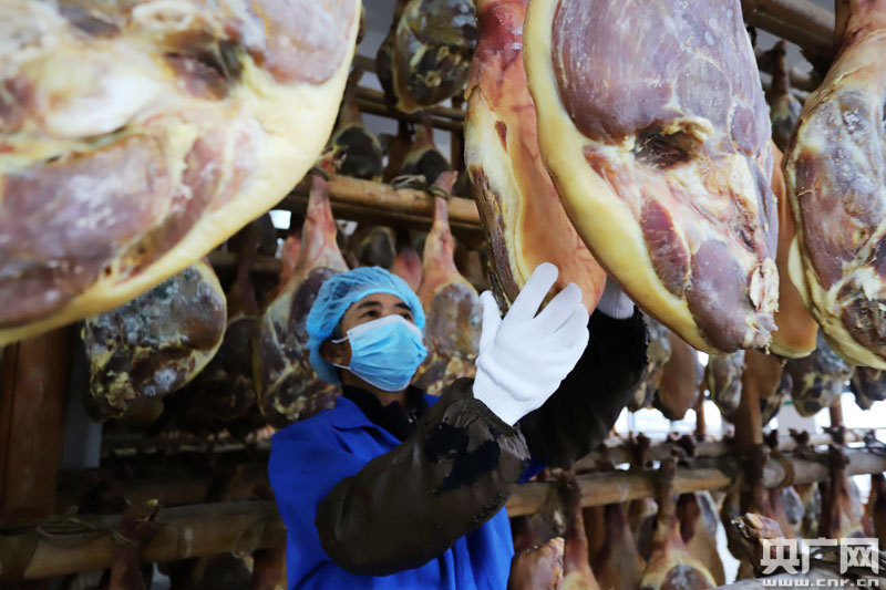 安?h楓田鎮(zhèn)一家火腿公司員工在觀察火腿發(fā)酵情況(央廣網(wǎng)發(fā) 通訊員劉麗強/攝)