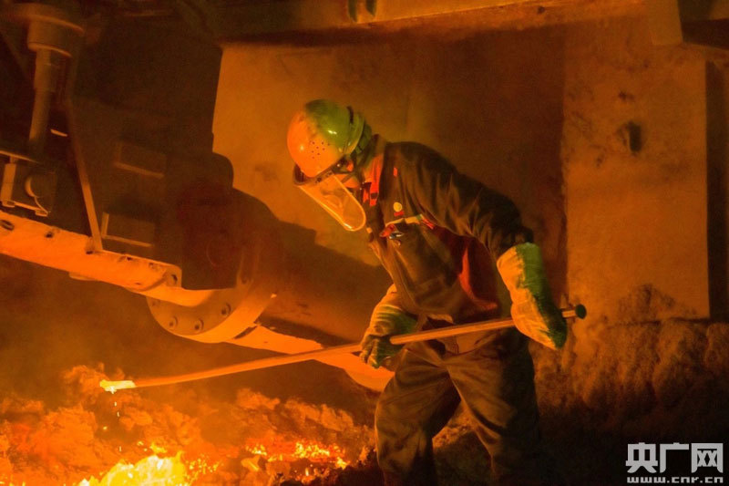 萍安鋼鐵安源鋼煉廠,爐前工正在出鐵口作業(yè)(央廣網發(fā) 通訊員張韶濱/攝)