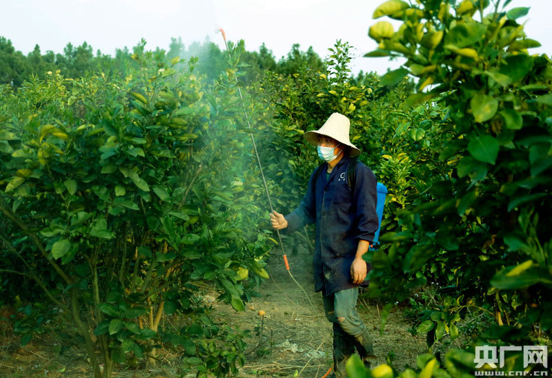 蜜柚種植戶正在噴施農藥防治病蟲害