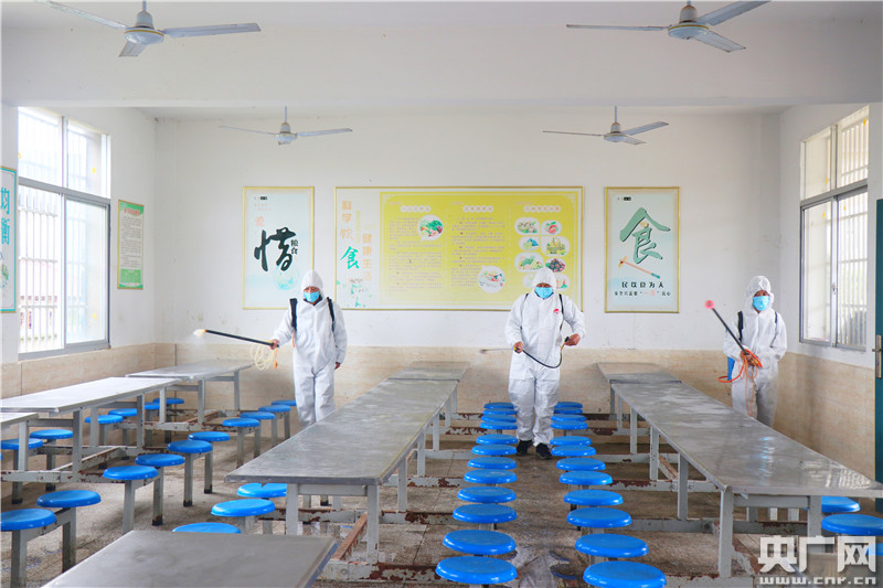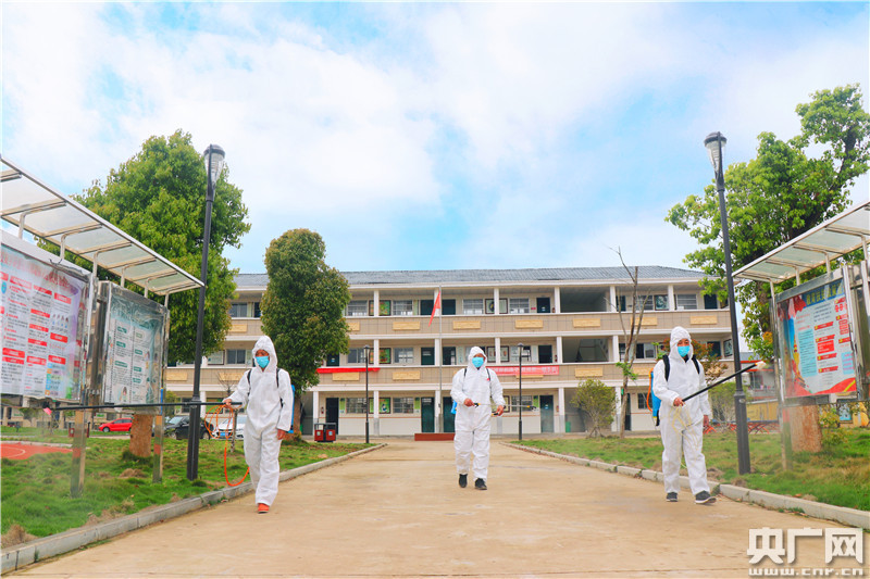 4月2日,余干縣康山墾殖場防疫小分隊(duì)對即將開學(xué)復(fù)課的校園進(jìn)行消殺防疫。(央廣網(wǎng)發(fā) 白賢才、劉月輝/攝)