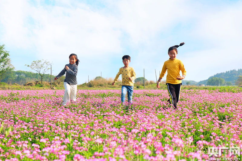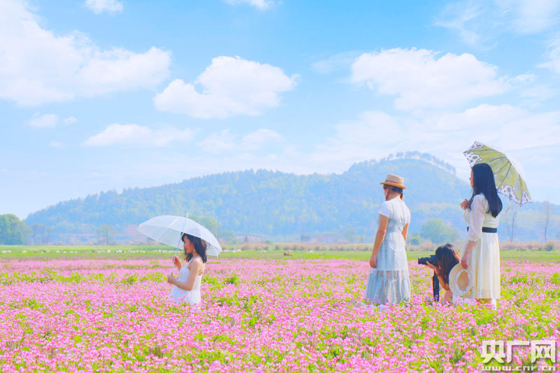4月9日,優(yōu)雅香濃的紫色花海里,游客們賞花留影,盡情享受田園美景