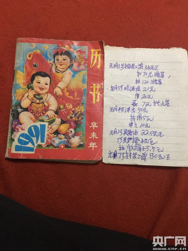 翻開(kāi)老舊的賬本,發(fā)黃的封面上留有那個(gè)年代特殊的記憶,大紅花環(huán)繞著一個(gè)大寫(xiě)的“!弊郑r(nóng)家歷三個(gè)字格外引人注目,曾春梅回憶說(shuō),那時(shí)候生活是真幸福,老公是油漆匠,兩人一個(gè)月工資加起來(lái)才130塊,工資雖然低,但是開(kāi)支也小,日子還算過(guò)得去,那個(gè)時(shí)候做條褲子五塊錢(qián),托兒費(fèi)也才七塊錢(qián)。在她的賬本上清楚的記錄著,元月16號(hào)吃酒 ,15元;元月17號(hào)買(mǎi)米,20元,打蛋卷,4元….不光是賬本,這些年來(lái),無(wú)論是購(gòu)買(mǎi)電器的發(fā)票、每月繳納的水電費(fèi)單子,還是人情往來(lái)的請(qǐng)柬,曾春梅都悉心保存著。