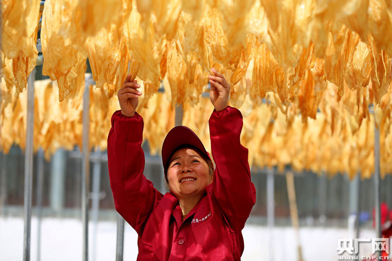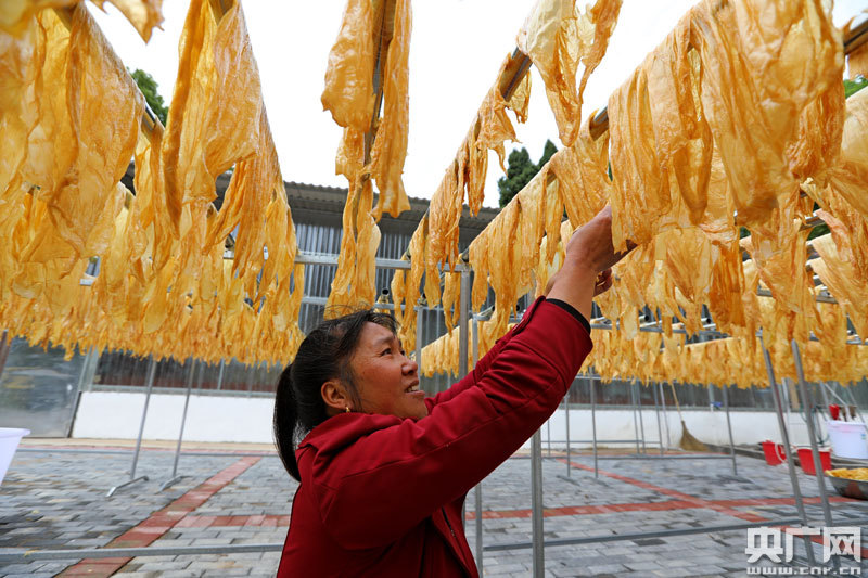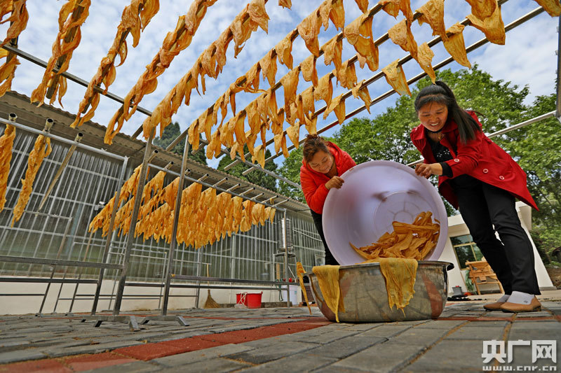 4月25日,工人正在江西省萬安縣高陂鎮(zhèn)符竹村腐竹加工合作社晾曬腐竹(央廣網(wǎng)發(fā) 通訊員邱哲 攝)