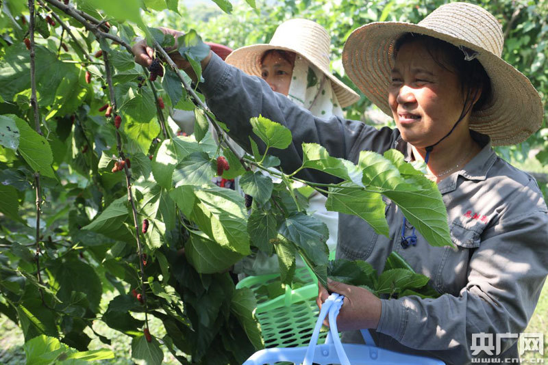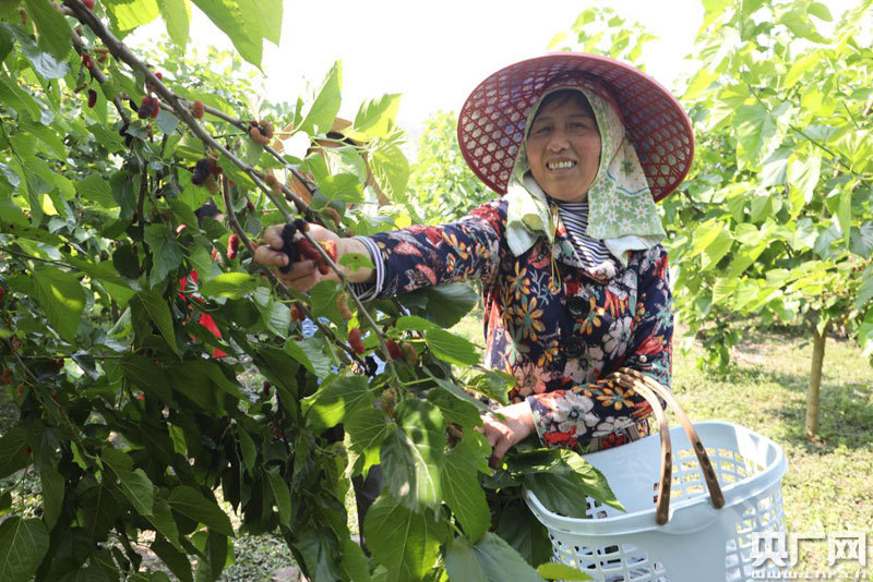 貧困戶湯蘭英在基地內(nèi)采摘桑葚