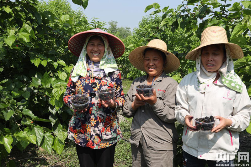 貧困戶湯蘭英和她的姐妹們展示基地內(nèi)的綠色桑葚