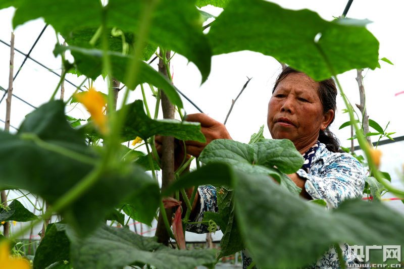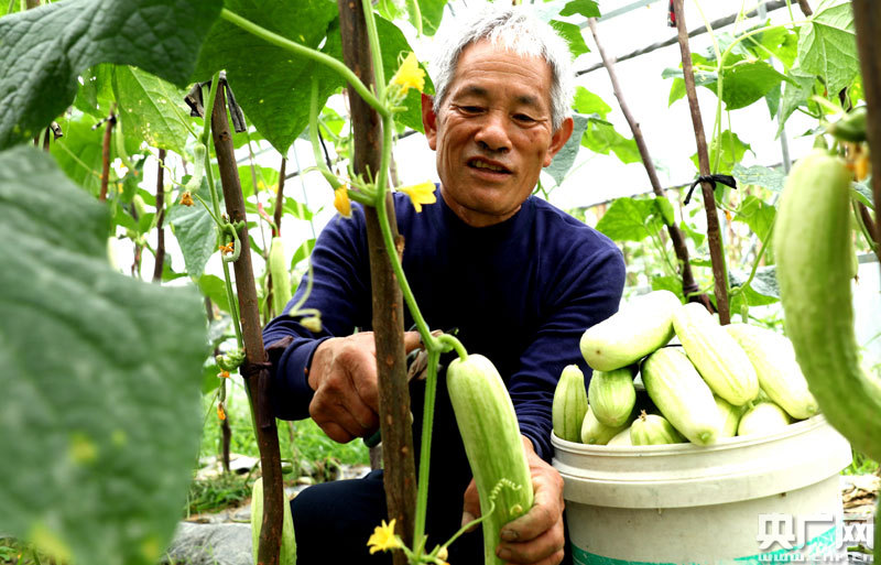 5月6日,江西省永新縣禾川鎮(zhèn)汴田村村民在采摘黃瓜