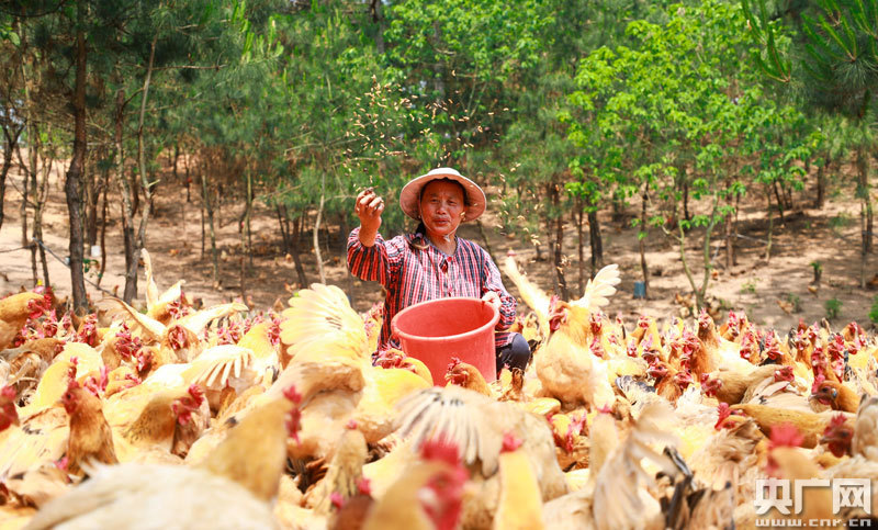 江西省吉安市泰和縣馬市鎮(zhèn)江濱村生態(tài)養(yǎng)殖基地,農(nóng)民在給林下散養(yǎng)的土雞喂食(央廣網(wǎng)發(fā) 通訊員司馬天民 攝)