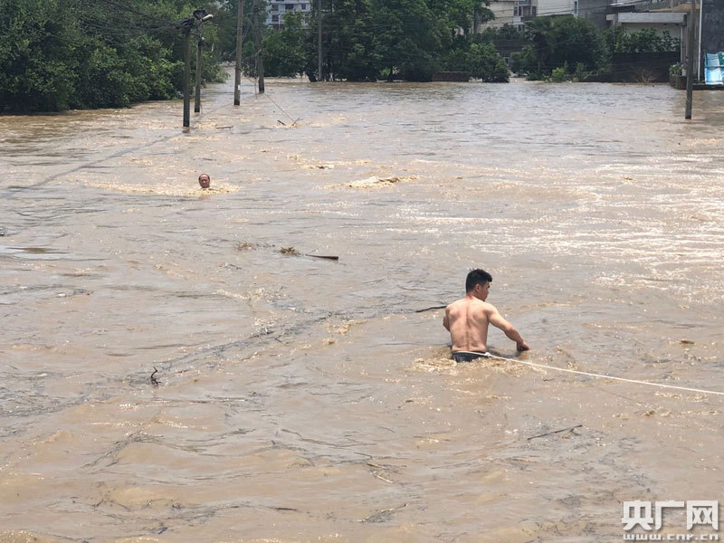 廖祥峰身上綁著繩索,跳入洪水中實施救援