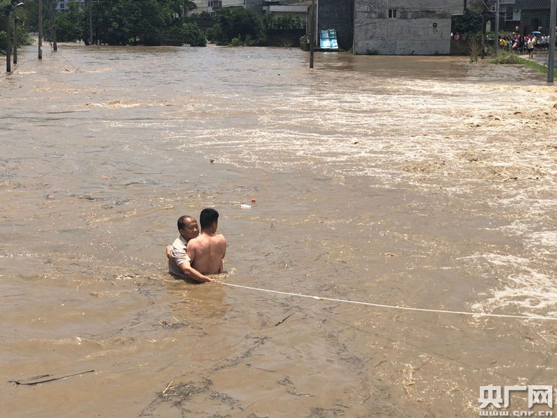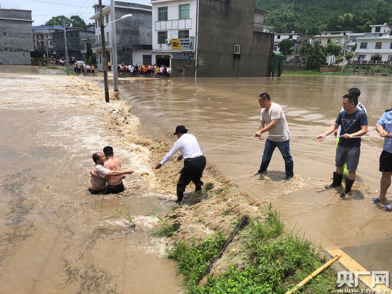 接到電話后,鎮(zhèn)村工作組第一時間趕到現(xiàn)場,眼看湍急的洪水就要將村民譚圣忠沖走,一旁的退役軍人服務(wù)站站長廖祥峰二話不說就跳下洪水救人,周圍的人迅速用繩子綁住廖祥峰的腰。