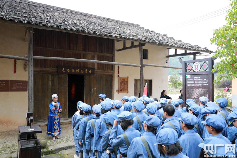 學(xué)生們在紅色革命根據(jù)地東固鎮(zhèn)敖上村毛澤東同志舊居前聆聽東固革命根據(jù)地創(chuàng)始人賴經(jīng)邦烈士孫女講解紅軍故事(央廣網(wǎng)發(fā) 通訊員供圖)