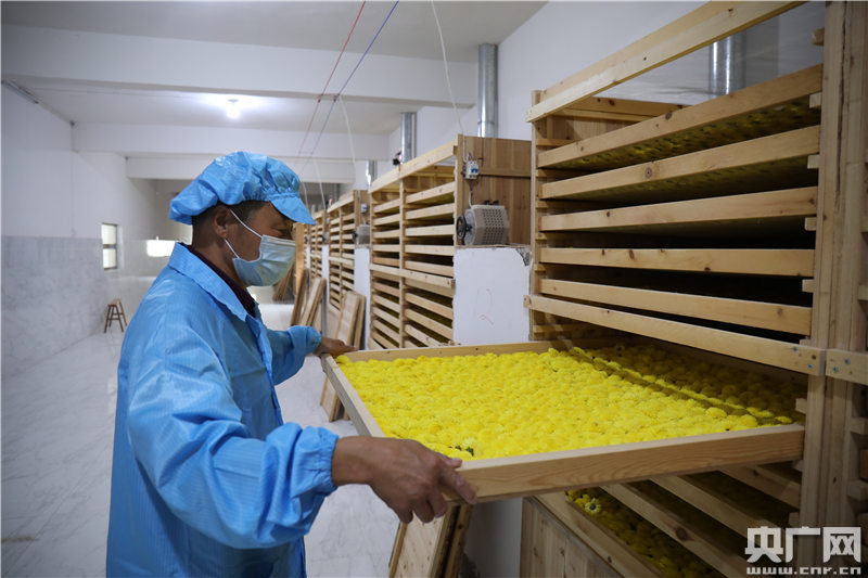 工作人員將分揀好的菊花進行烘干(央廣網(wǎng)發(fā) 通訊員彭琴 攝)