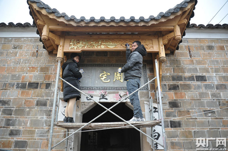叮叮當(dāng)當(dāng)……遠(yuǎn)處傳來一陣陣房屋裝修的聲音,原是一座名為“周宅”的仿古新建民居在裝修,只見兩位工人正在給門上的花紋描金。