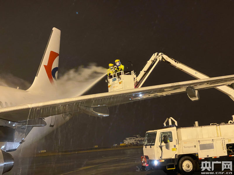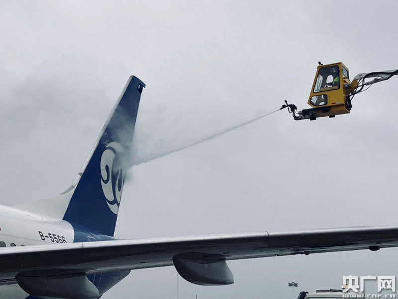 除冰車對航空器進行除冰(央廣網發(fā) 通訊員供圖)