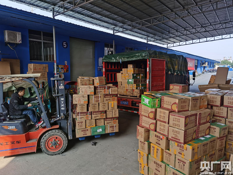 萬安縣倉儲(chǔ)物流集散中心工作人員將萬安臍橙運(yùn)送上車(央廣網(wǎng)發(fā) 通訊員供圖)