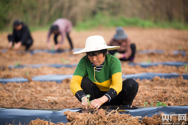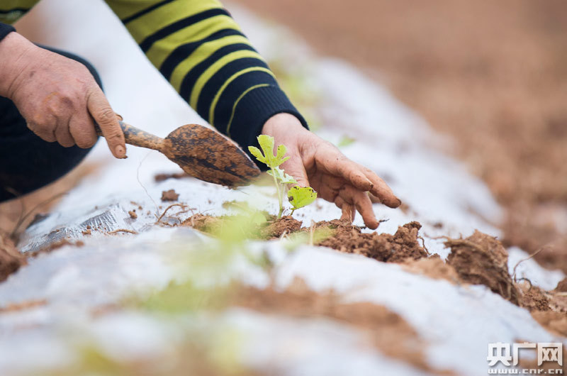 4月15日,貧困戶在江西九江市都昌縣萬戶鎮(zhèn)西湖村西瓜種植基地栽種西瓜苗。(央廣網(wǎng)發(fā) 通訊員傅建斌 攝)