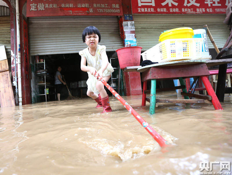6月12日,江西省峽江縣巴邱鎮(zhèn)一個小孩正在幫助清掃積水。(通訊員曾雙全/攝)