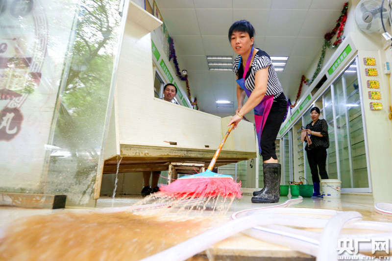 6月12日,江西省峽江縣巴邱鎮(zhèn)一家商戶店主正在清掃店里積水。(通訊員曾雙全/攝)