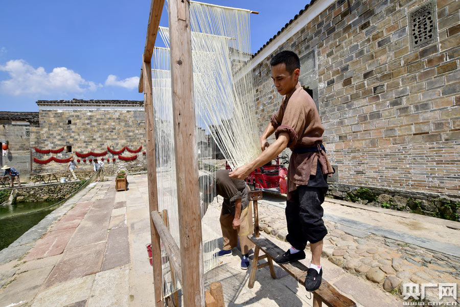 2019年9月14日,江西省撫州市金溪縣雙塘鎮(zhèn)竹橋古村手搖獅、馬步燈、油面制作等非遺表演,成為當?shù)芈糜我坏漓n麗的風景線。圖為油面制作表演現(xiàn)場。(鄧興東 攝)