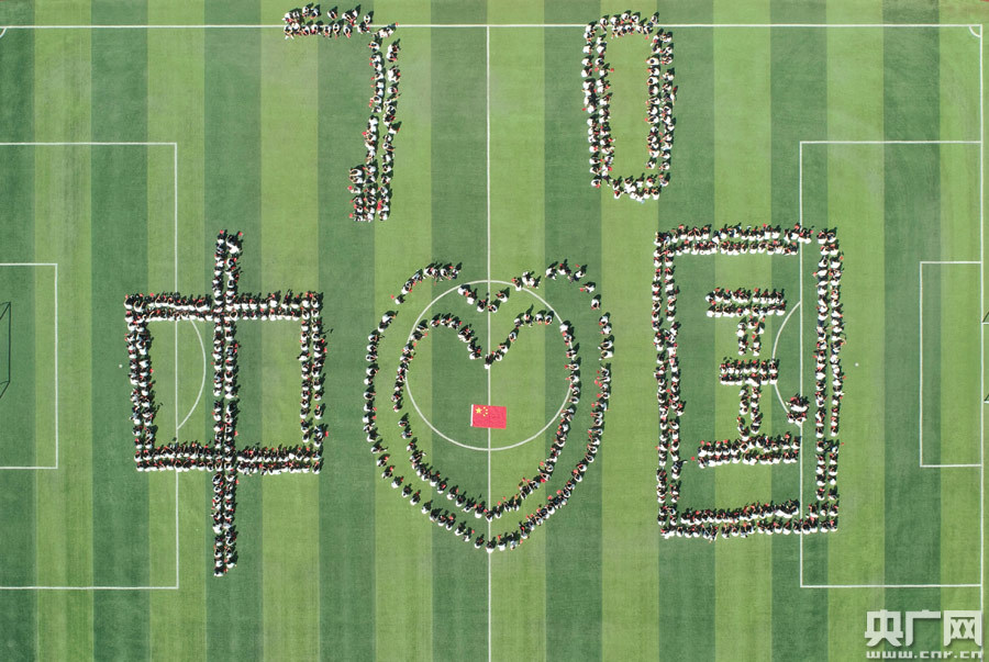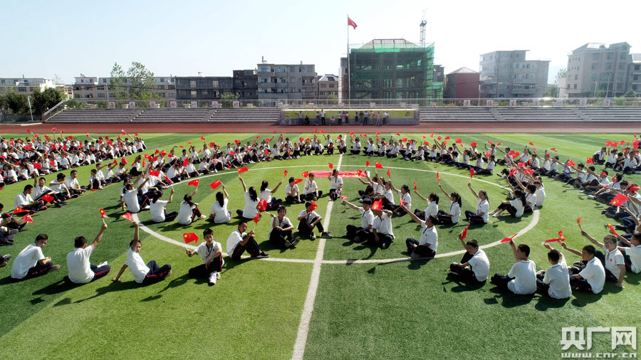 當(dāng)日,晴空萬(wàn)里,風(fēng)和日麗,紅旗飄揚(yáng),歌聲嘹亮?h四中學(xué)800余名學(xué)子在運(yùn)動(dòng)場(chǎng)擺出“中國(guó)”、“愛(ài)心”、“70”等字樣或造型,他們揮舞著國(guó)旗,高聲齊唱 《我愛(ài)你,中國(guó)》《我和我的祖國(guó)》等歌曲,在莊嚴(yán)的五星紅旗下,激昂豪邁的歌聲,響徹校園,振奮人心。