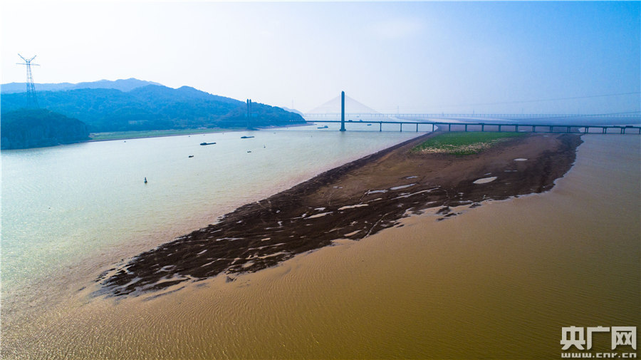 10月10日,鄱陽(yáng)湖口,往日被湖水淹沒(méi)的灘涂大面積顯露出來(lái)。(央廣網(wǎng)發(fā) 通訊員李學(xué)華攝)