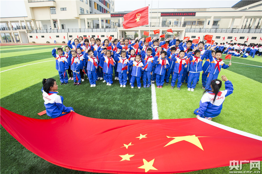 10月12日,江西九江市都昌縣各小學(xué)校開展“我愛紅領(lǐng)巾,星火代代傳——我們是共產(chǎn)主義接班人”主題活動(dòng),通過入隊(duì)儀式、唱響《中國少年先鋒隊(duì)隊(duì)歌》、與國旗合影等形式,慶祝中國少年先鋒隊(duì)建隊(duì)70周年。(央廣網(wǎng)發(fā) 通訊員傅建斌 攝)