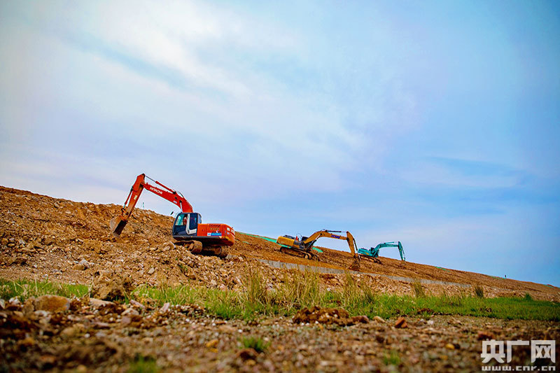 在都昌縣南溪圩堤挖掘機(jī)正在進(jìn)行外壩整坡(央廣網(wǎng)發(fā) 通訊員劉洵/攝)