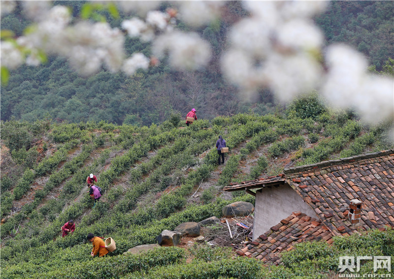 2020年3月5日,茶農(nóng)正在江西省萬安縣沙坪鎮(zhèn)外龍村茶園采摘春茶,一片忙碌景象。