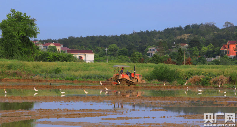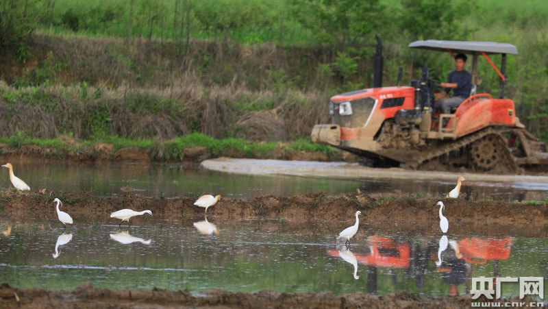 4月13日,在江西省吉安市泰和縣南溪鄉(xiāng)芳橋村,農(nóng)民翻耕農(nóng)田,白鷺嬉戲覓食,相映成趣(央廣網(wǎng)發(fā) 通訊員司馬天民 攝)