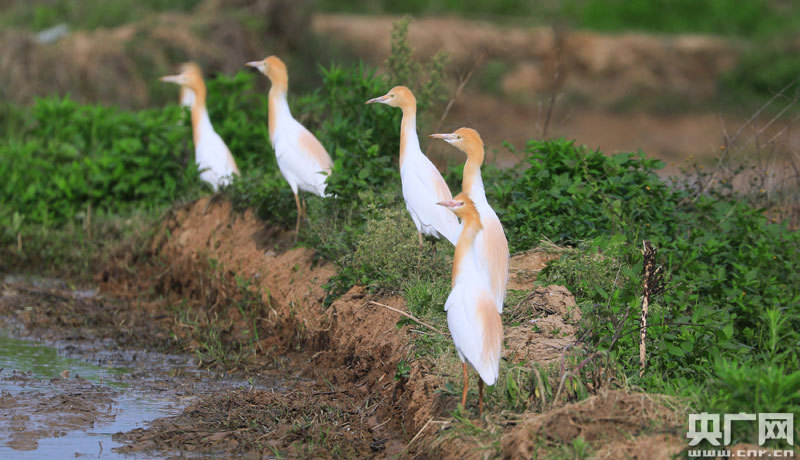 4月13日,在江西省吉安市泰和縣南溪鄉(xiāng)芳橋村,一群白鷺聚集在剛翻耕的農(nóng)田里嬉戲覓食(央廣網(wǎng)發(fā) 通訊員司馬天民 攝)