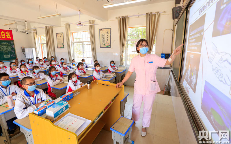 5月11日,在江西省九江市都昌縣萬里中學(xué)七年級(jí)教室,縣中醫(yī)院抗疫護(hù)士柳芳芳為學(xué)生們講解防控知識(shí)