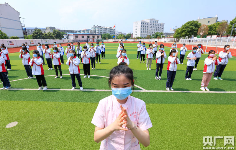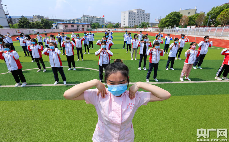 5月11日,在江西省九江市都昌縣萬里中學(xué)操場(chǎng)上,縣中醫(yī)院護(hù)士李欣欣教學(xué)生們“洗手舞”